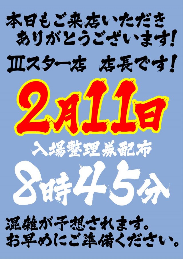 朝8時45分よりファミリーマート側の出入り口付近にて整理券の配布を致します。 |