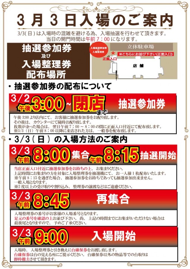 朝8時45分よりファミリーマート側の出入り口付近にて整理券の配布を致します。 |