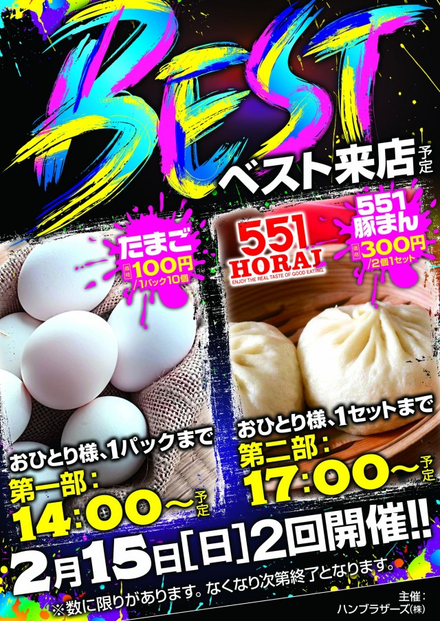 8:45~抽選開始 8:55~再整列・番号確認 9:00~入場開始 整列場所など詳しくは最新情報のページをご覧ください。 |