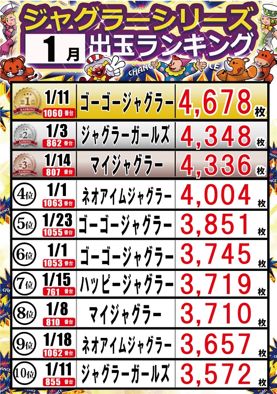 1/25ジャグラー出玉ランキング更新!!