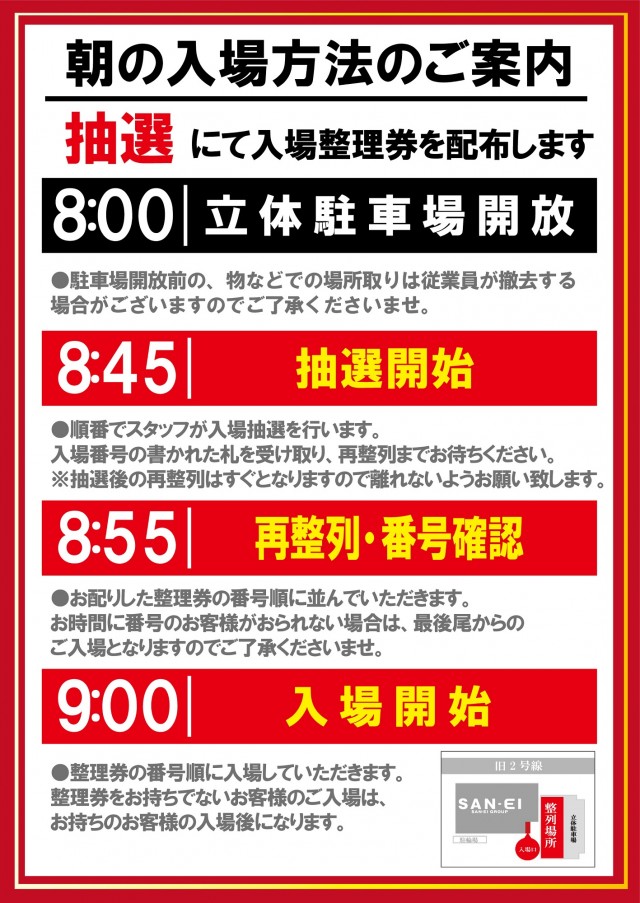 8:45~抽選開始 8:55~再整列・番号確認 9:00~入場開始 整列場所など詳しくは最新情報のページをご覧ください。 |