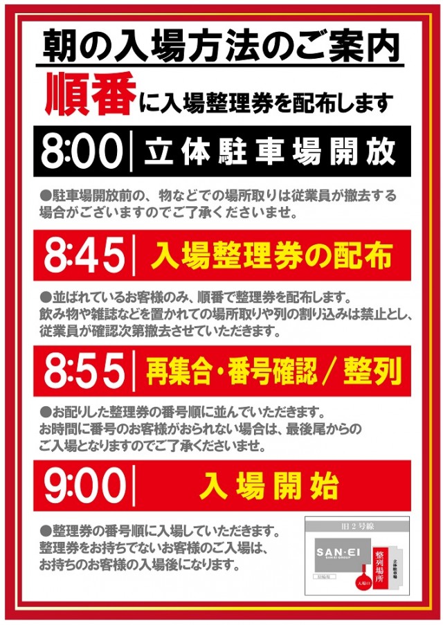 8:45~抽選開始 8:55~再整列・番号確認 9:00~入場開始 整列場所など詳しくは最新情報のページをご覧ください。 |