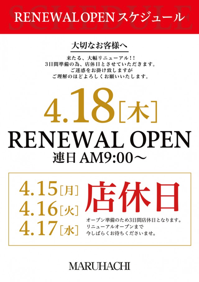 【重要なお知らせ】リニューアル準備の為【店休日】となります。