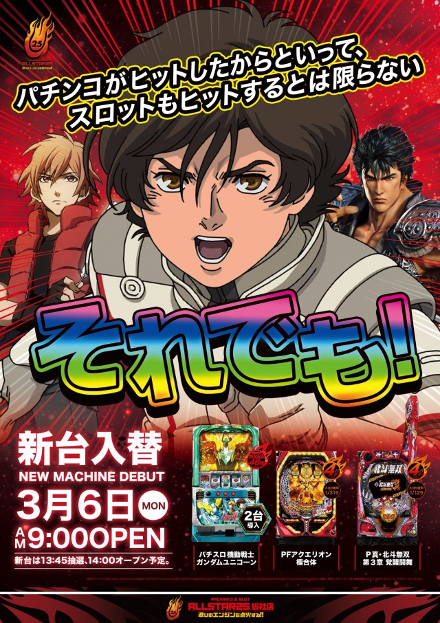 明日は、パチンコでロングヒットととなった「機動戦士ガンダムユニコーン」がスロットで登場。