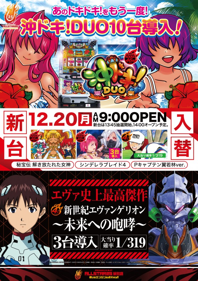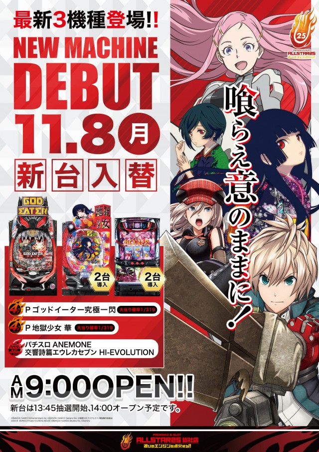 パチスロANEMONE 交響詩篇エウレカセブンHI-EVOLUTION(AT)2台新台は13:45抽選開始、14:00オープン予定です。