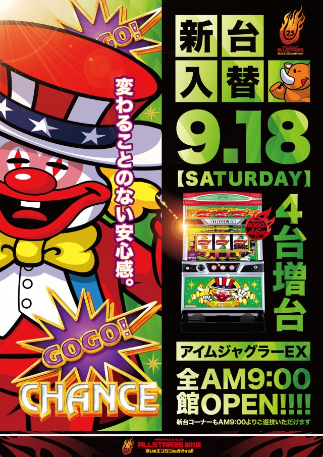 5号機「ゴーゴージャグラー2」が設置期限を迎え、6号機「ファンキージャグラー2」の登場です。