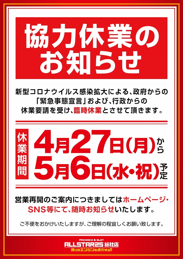 なお営業再開のご案内につきましてはホームページ・SNS等にて随時お知らせさせていただきます。