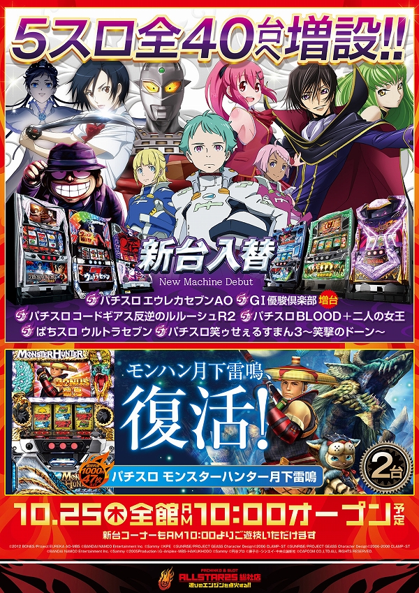 明日10月25日(木)は5スロを8台増設、午前10時よりのオープン予定です。