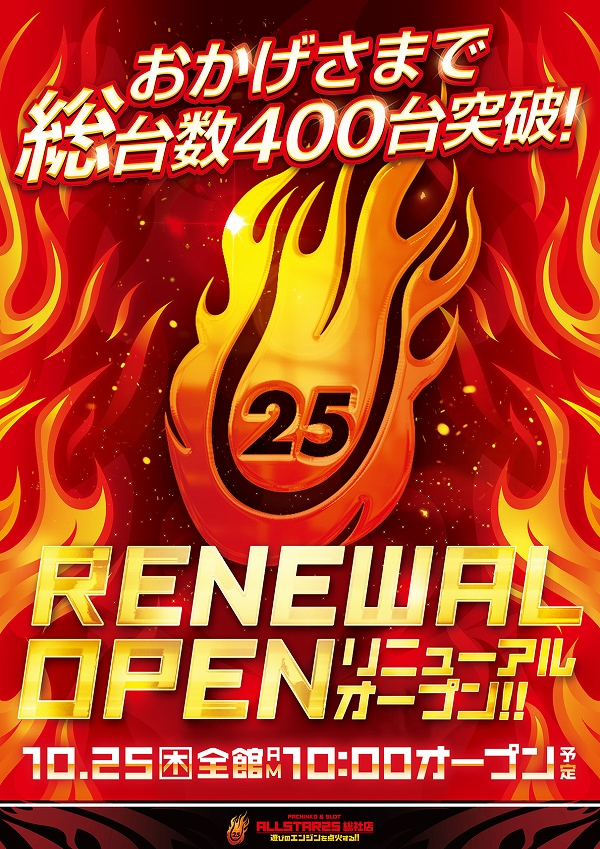 リニューアル当日の入場方法、新台などはホームページで公開中ですが、また後日こちらでもお知らせさせていただきますね。