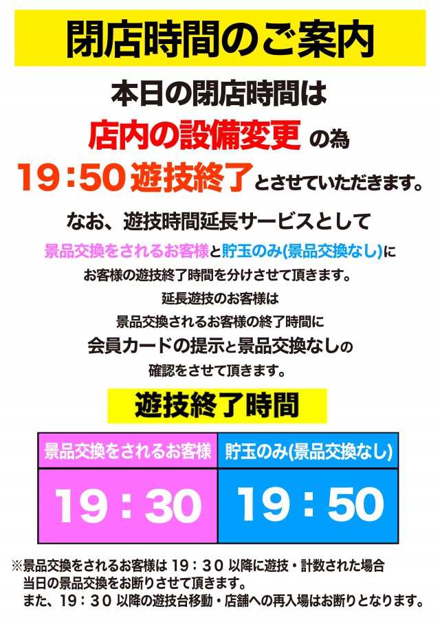9:00 ~ 22:30(会員様は22:50まで延長遊技可能) |