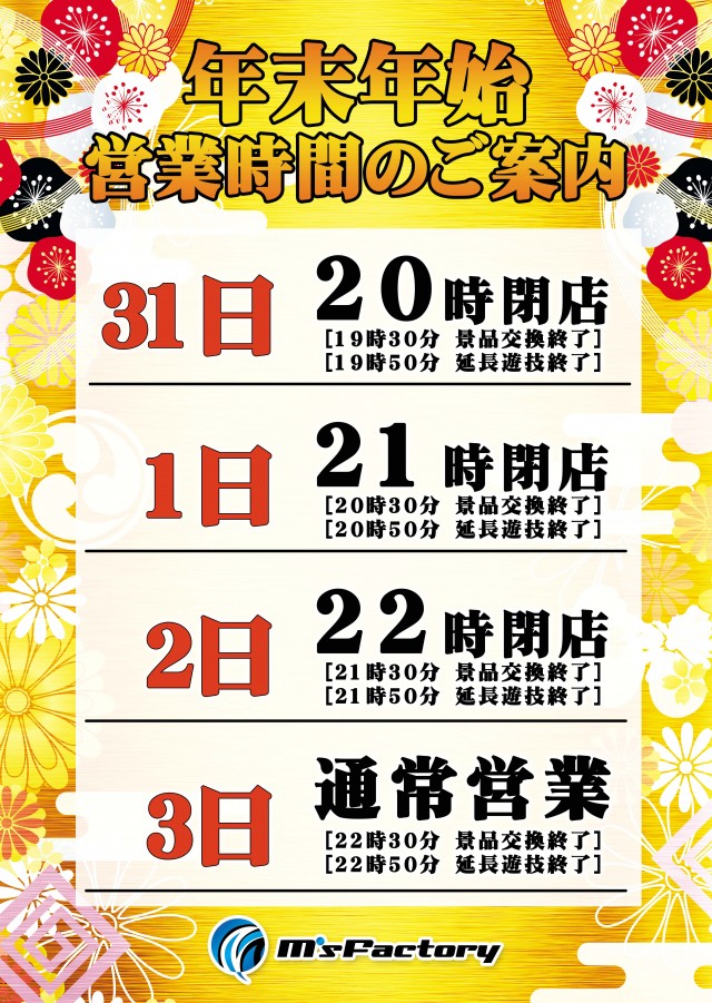エムズファクトリーから年末年始の営業時間のお知らせです!!