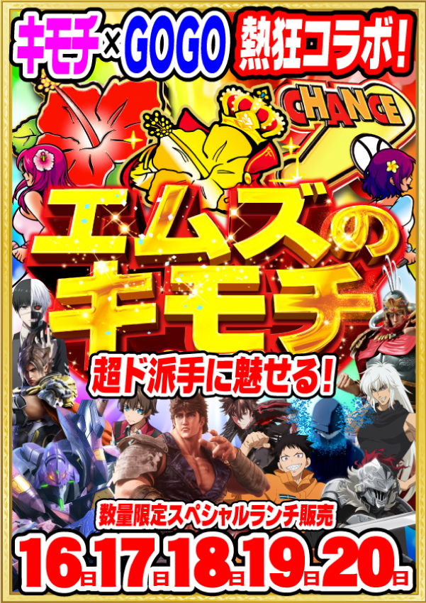 圧倒開放!第三火曜日★エムズのキモチ×GOGO★熱狂コラボで楽しさ満載!超ド派手に魅せる!ニューキングハナハナ県内最大設置!リバーで沖スロを打とう♪