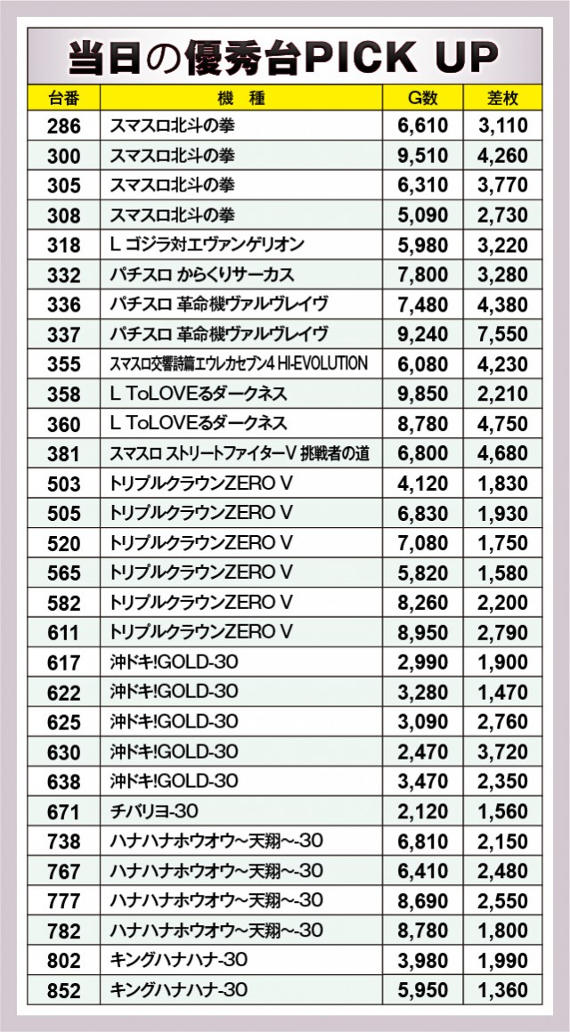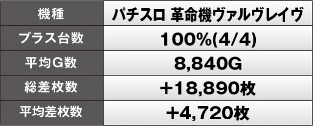 突出した熱気を放った『パチスロ 革命機ヴァルヴレイヴ』は、設置された全台がプラス差枚数を達成。その回転数も8,840Gとなっており、遊技していたファンは明らかな感触に恍惚の表情を浮かべていたことだろう。また総差枚数・平均差枚数も可能性の有無を物語っており、同店の気概を十分に感じられる内容となっている。
