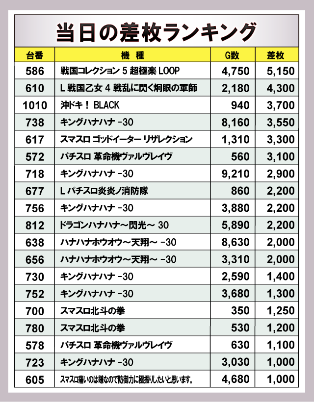 差枚ランキングをチェックしてみると、この日最も優秀だったのは、『戦国コレクション5超極楽LOOP』で+5,000枚OVERをマーク。さらに、『L戦国乙女4 戦乱に閃く炯眼の軍師』は、+4,000枚OVER!『沖ドキ!BLACK』『キングハナハナ-30』『スマスロ ゴッドイーター リザレクション』『パチスロ 革命機ヴァルヴレイヴ』は、+3,000枚OVER達成!様々な機種からまとまった出玉を獲得しており、遊技するファンは笑顔をこぼしていたに違いない。