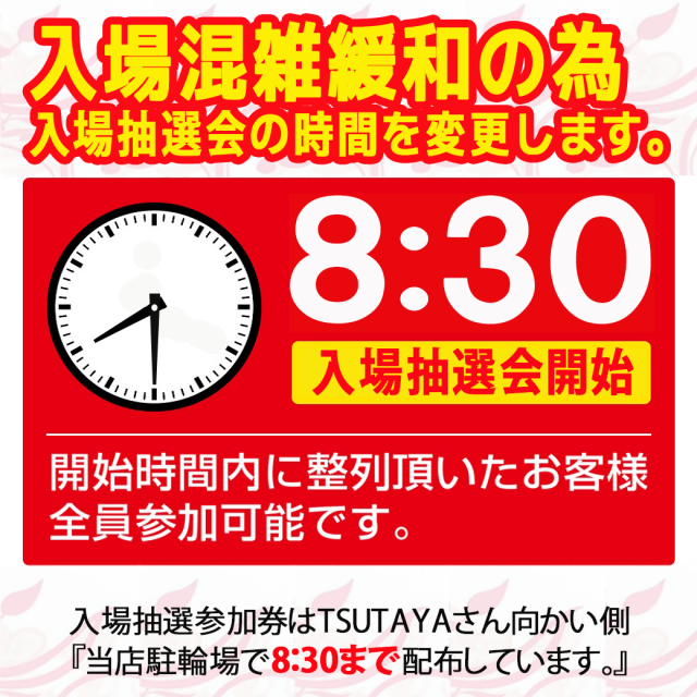 朝8時40分より当店駐輪場にて入場抽選会を開催しております。※状況に応じて抽選時間が変更する場合がございます。毎日配信しております「お知らせ」から確認お願い致します。 |