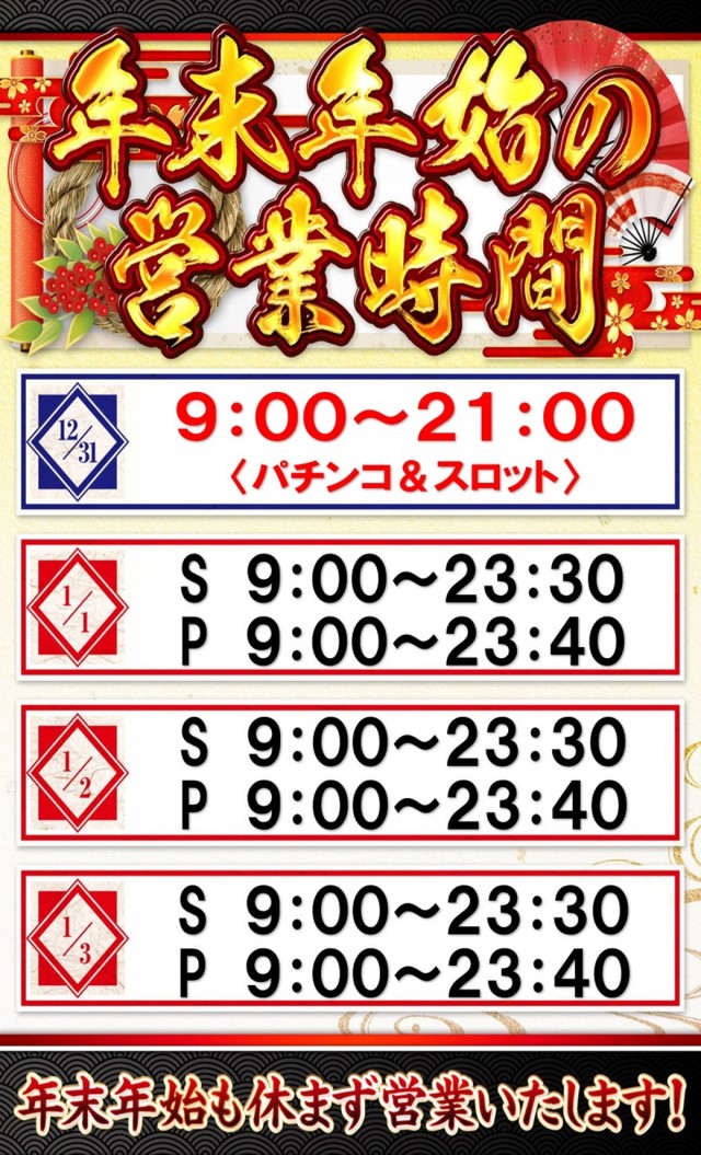パチンコ 9:00 ~ 23:30 スロット 9:00~23:40 |
