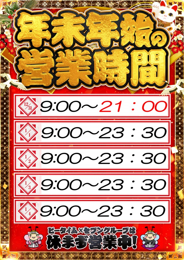 スロット 9:00 ~ 23:30 パチンコ 9:00~23:30 |
