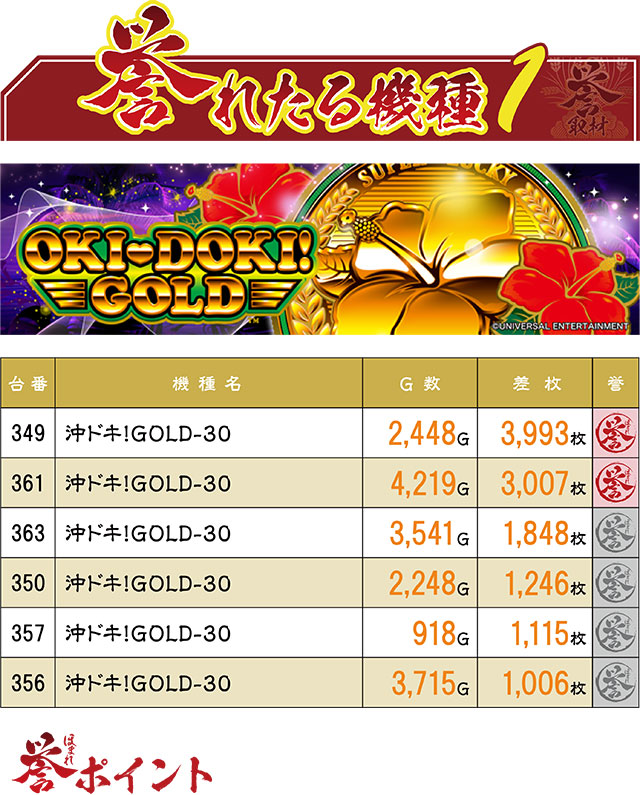 『沖ドキ!GOLD-30』からは、6台の誉マークが出現。いずれも総ゲーム数が多くないためずば抜けた記録はなかったが、それでも349・361番台は+3,000枚を上回る好結果を披露してくれた。