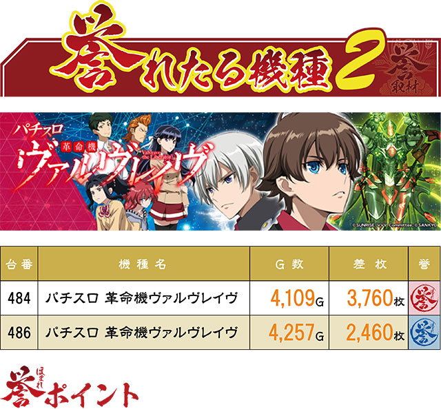 4台設置の『パチスロ 革命機ヴァルヴレイヴ』は、半数の2台に誉マーキング。この2台は挙動も良好で、優秀台を思わせるムーブだった。ということは、ニブイチだったとか!?