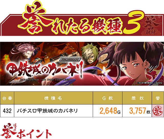 2台設置の『パチスロ甲鉄城のカバネリ』も、半数の1台に誉マークあり。安定した挙動で+3,500枚を突破することとなった。もしや『カバネリ』もニブイチ…!?