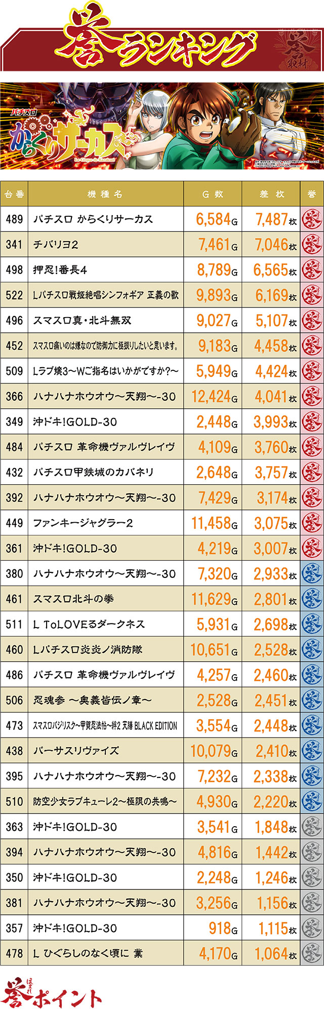 人気マシンたちとの差枚レースに勝ち抜き、この日の首位記録の座についたのは、『パチスロ からくりサーカス』。2位の『チバリヨ2』との差がたったの441枚だったことから、過酷な首位争いだったことがうかがえた。この日は新台の『Lパチスロ戦姫絶唱シンフォギア 正義の歌』『スマスロ真・北斗無双』に加え、『バーサスリヴァイズ』『防空少女ラブキューレ2〜極限の共鳴〜』『L ひぐらしのなく頃に 業』などの1台機種もしっかりランクインを果たしていた。