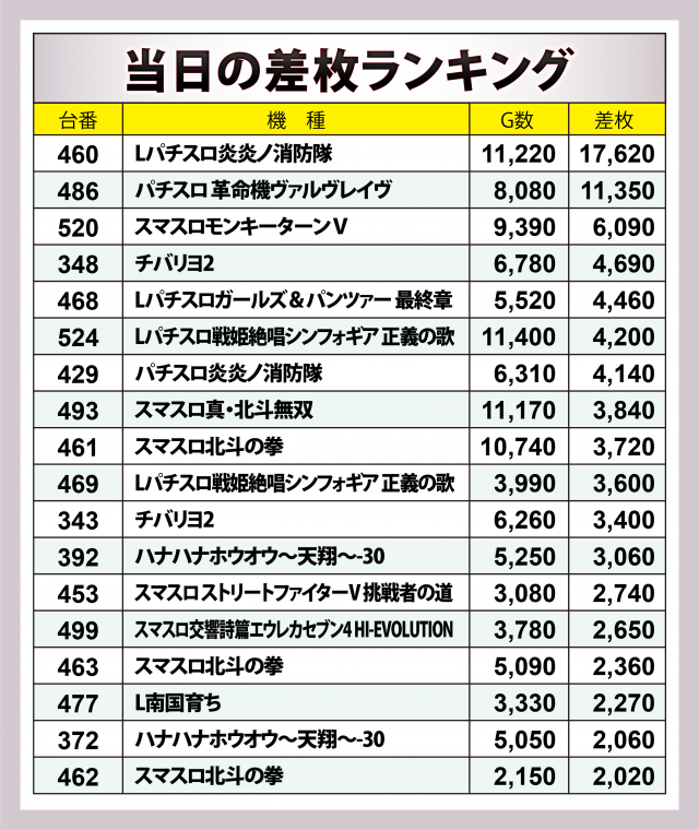 その他では、『チバリヨ2』 『Lパチスロガールズ&パンツァー 最終章』 『Lパチスロ戦姫絶唱シンフォギア 正義の歌』『パチスロ炎炎ノ消防隊』 の4マシンが+4,000枚オーバーに成功した。