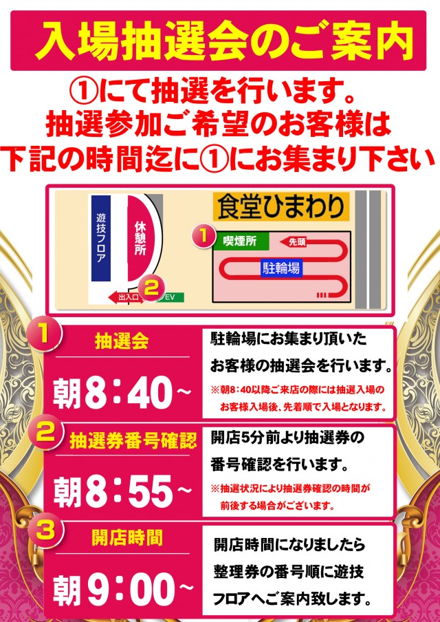 AM8:40分より抽選開始。AM8:55から再整列。AM9:00入場開始。 |