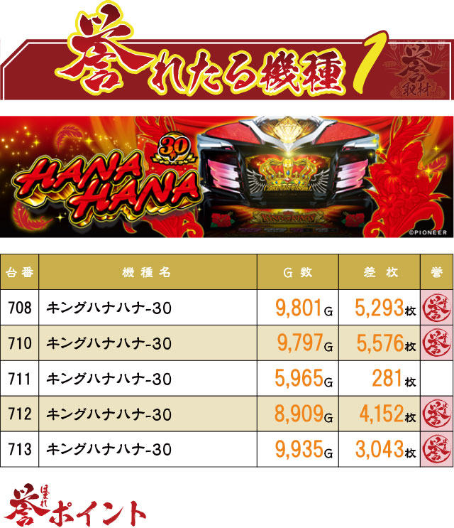これぞ沖スロ発祥の地の真骨頂!とばかりに、『キングハナハナ-30』から誉マークが大量出現!中でもこちらの5台並びのゾーンは、5台すべてがプラス、さらに4台に赤誉マーキング!