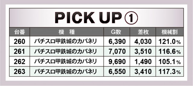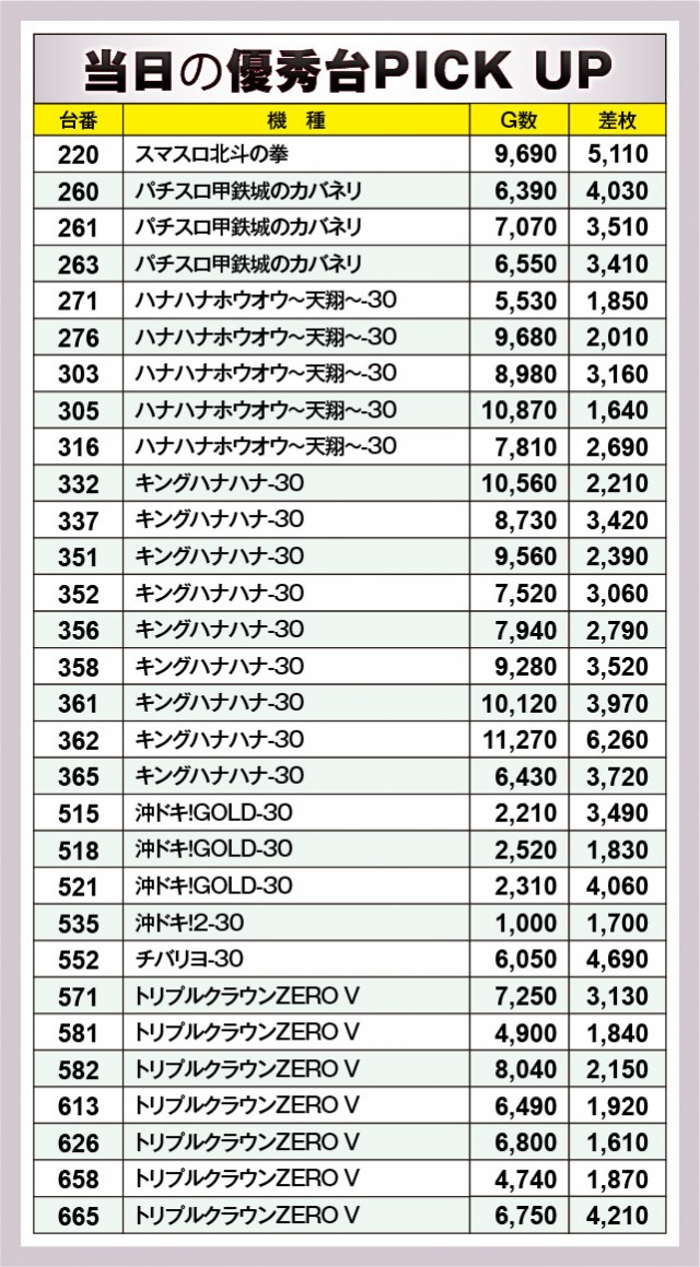 上表の優秀台には沖スロの名前がズラリと並んでいる。やはり地域性が色濃く出ており、そんな中で『スマスロ北斗の拳』『パチスロ鋼鉄城のカバネリ』の両名も名を連ねた。前者は220番台+5,110枚をマークし、さらには9千回転台をマーク。後者も活気づいている様子が手に取る分かる数字で、3~4千枚OVERという十分な熱気を放っていた。