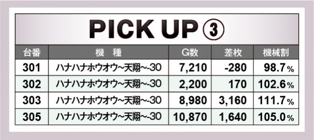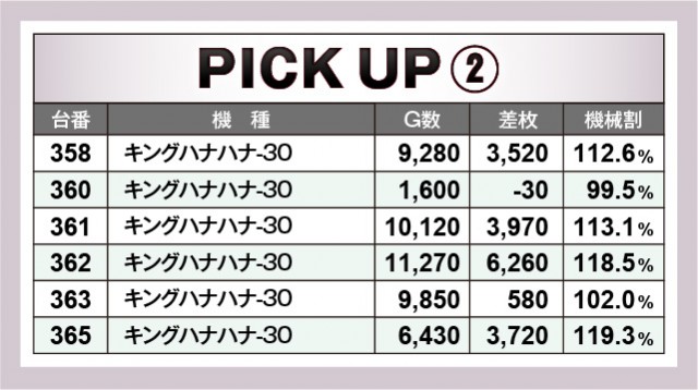 『パチスロ鋼鉄城のカバネリ』全4台はプラス差枚を達成しており、同機種にポテンシャルが秘められていたのが分かる。260番台+4,030枚という結果からも、高い活気と熱気を形成していたようだ。そして『キングハナハナ-30』『ハナハナホウオウ~天翔~-30』の両『ハナハナ』シリーズは、ともに万回転OVERを達成。362番台+6,260枚や303番台+3,160枚と、こちらも高い熱量でファンに満足度の高い1日を提供していたと言える。