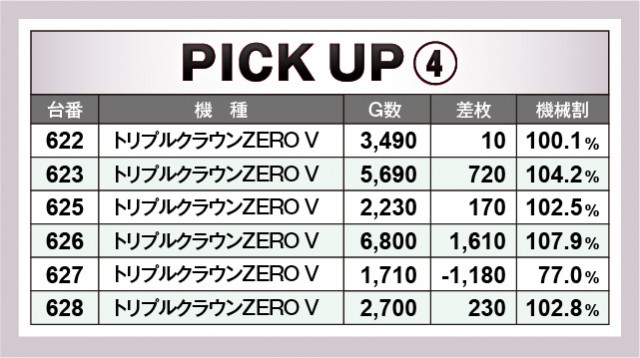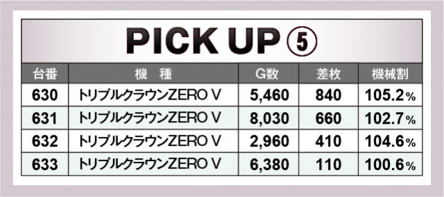 店内に全76台が設置されている『トリプルクラウンZERO V』は、多くのファンが競い合うかのようにレバーを叩いていたのが印象的だ。631番台8,030Gという数字から明らかな好感触を窺うことができ、同店が丁寧に扱っているのも頷けるだろう。大きな熱気こそ確認できないが、誰もが注目しているのは間違いないため、次回以降での盛り上がりに期待だ。