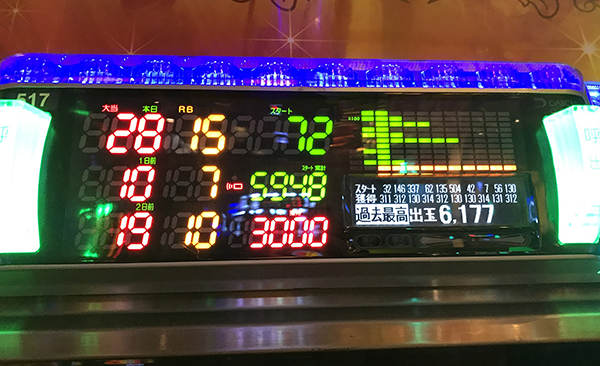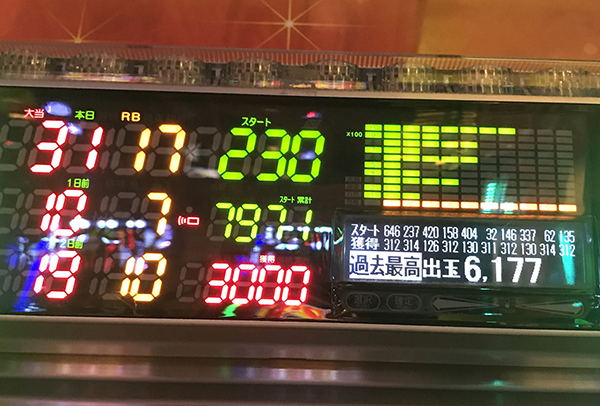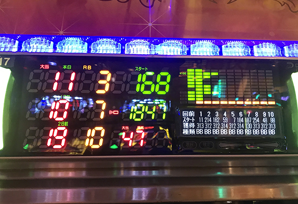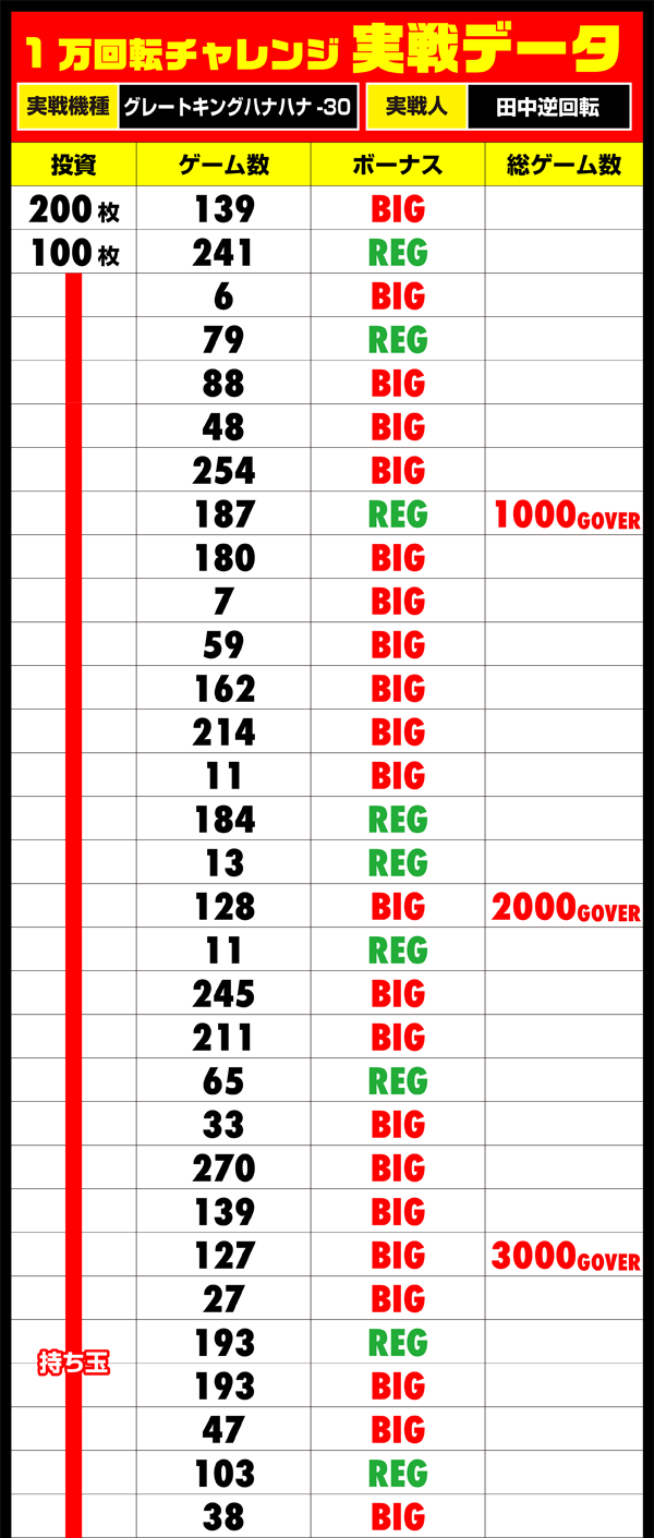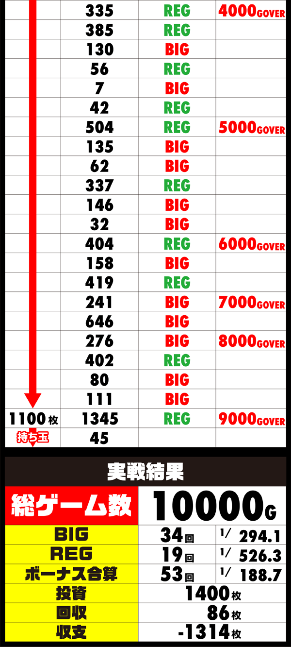 BIGに偏る展開は変わらなかったものの、最後にみせた1300G以上のハマリなどを活かし、制限時間内にしっかりと1万回転を達成した。