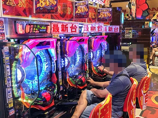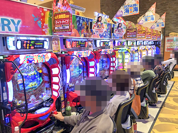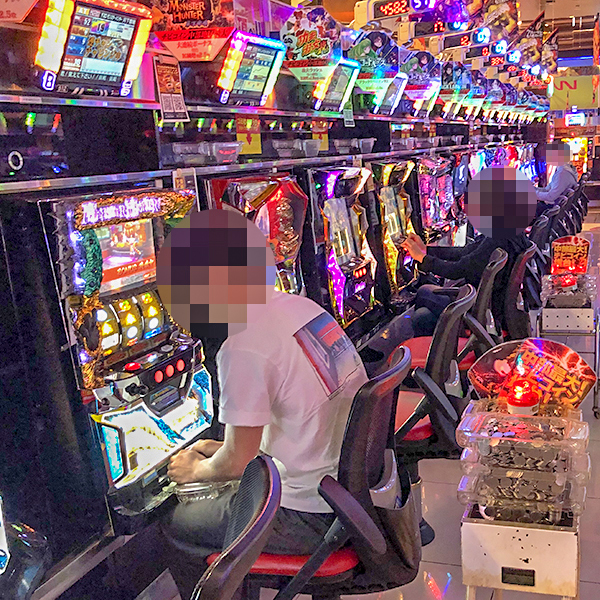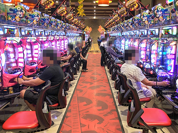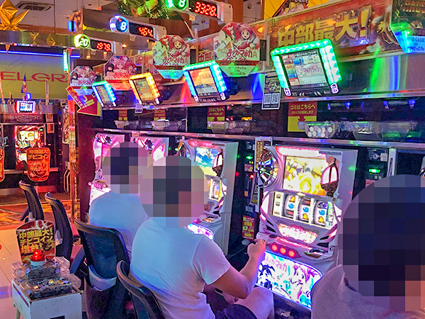 取材時の店内には多くのプレイヤーが来店。パチンコ・パチスロともに、様々な機種が支持を集めていた。