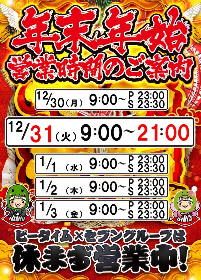 9:00 ~ ぱちんこ閉店23:00 スロット閉店23:30 |