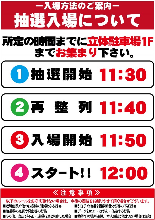 AM8:45分より抽選開始。AM8:55から再整列。AM9:00入場開始。 |