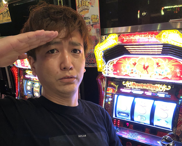開店後はさまざまな機種のなかから相方に「グレートキングハナハナ-30」をチョイス。礼義正しく台に敬礼をしてレバーを叩きはじめた。