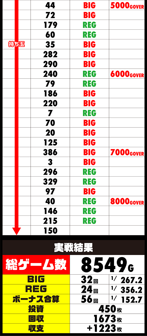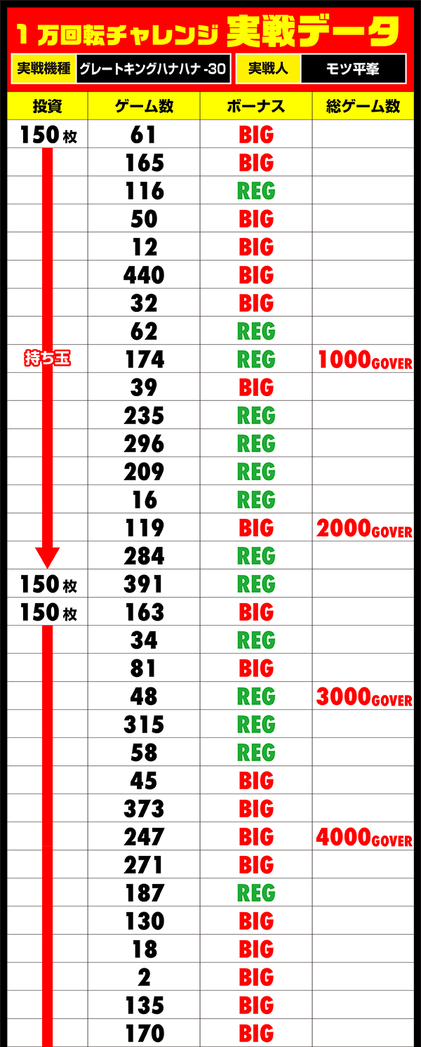 18時にようやく4600Gを突破と、大幅にペースが遅れてしまっているモツ平峯。遊技を純粋に楽しむことに目的を切り替えたのか、ボーナスを獲得するたびに笑顔をみせていた。