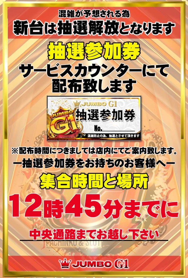 【店内休憩所にて実施】8:35~抽選参加券配布▶8:40~抽選開始▶8:50~入場再整列▶8:55入場 ※抽選時間に関してましては変更される場合がございますので、事前告知をご確認ください。 |
