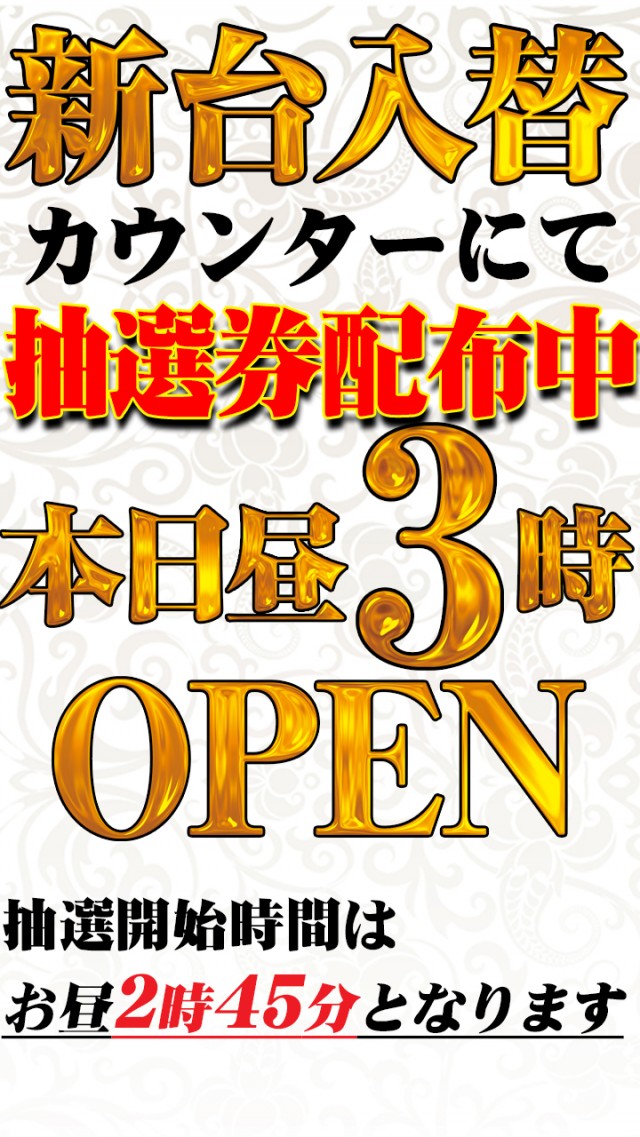 本日のご案内➡この後、新台3時オープン!!抽選券配布中!!