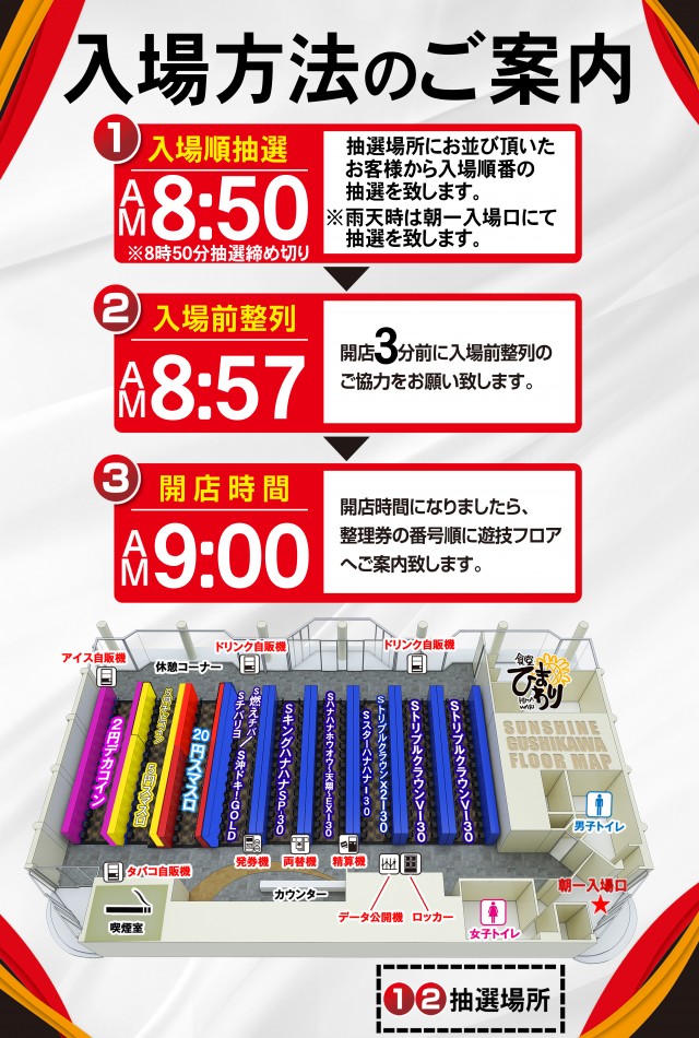 【通常】8:50抽選開始 ➡ 8:57抽選順整列 ➡ 9:00入場開始 |