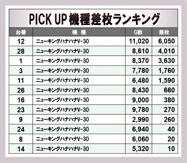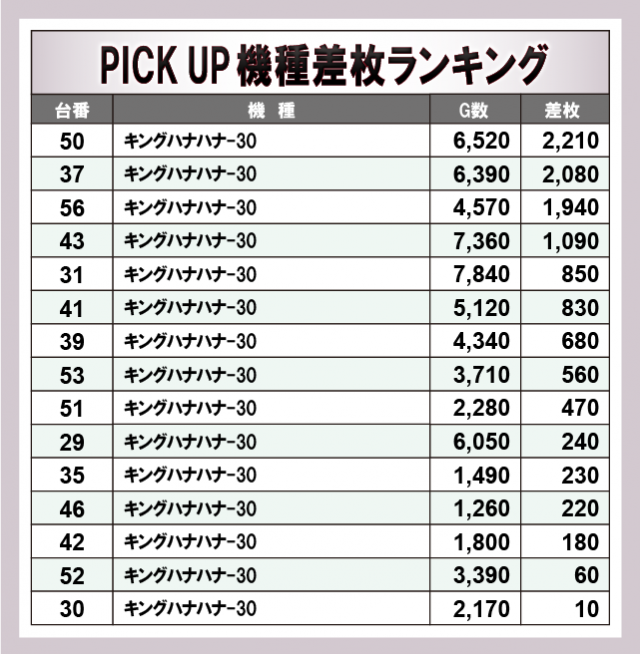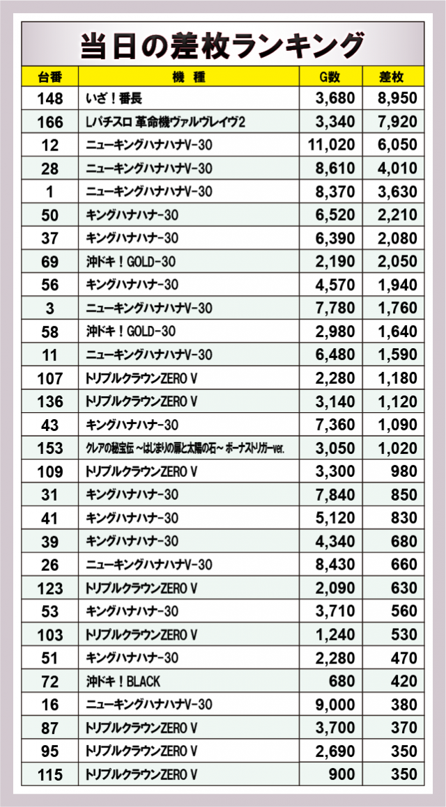 差枚ランキングでは、沖スロの王道「ハナハナ」シリーズがしっかり存在感を発揮。高G数×プラス差枚の台が複数並び、地元ファンが信頼して回していた様子がうかがえる。派手さよりも安定感を大切にした沖縄らしい結果と言えるだろう。