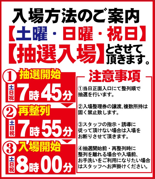 ★平日:08時45分~抽選開始 ☆土日祝日:07時45分~抽選開始 ■8or9時55分~再整列➡8or9時~00分入場となります! |