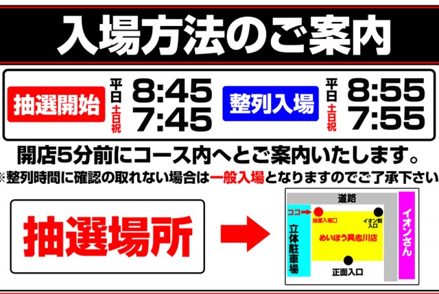 【平日】AM8:45分より抽選開始。整列入場AM8:55 【土日祝】AM7:45分より抽選開始。整列入場AM7:55 |