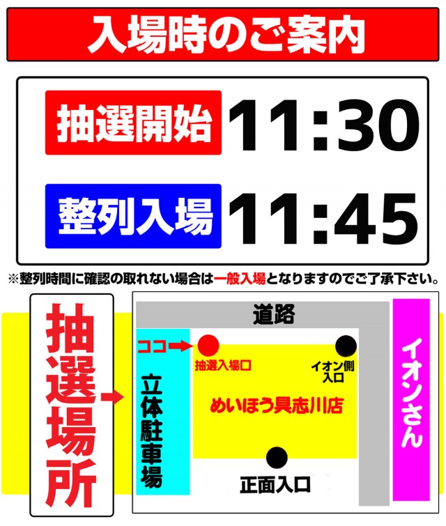 【平日】AM8:45分より抽選開始。整列入場AM8:55 【土日祝】AM7:45分より抽選開始。整列入場AM7:55 |