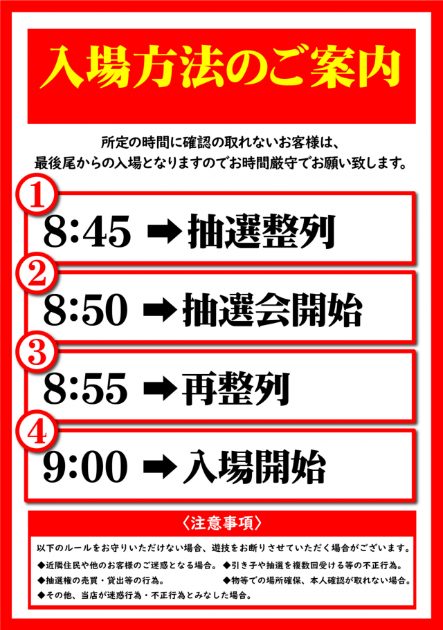 【通常】8:45入場整理券配布 【その他】8:45抽選整列▶8:50抽選開始 ※抽選入場案内に関して、事前告知を確認下さい。 |