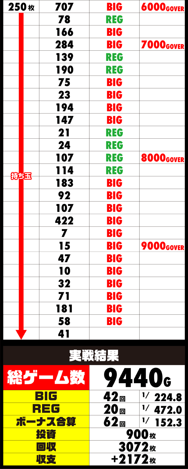 なんとかゲーム数を稼いで残り1000Gというところまでは辿りついたものの、最後はボーナスの連打に阻まれる形で時間切れ。