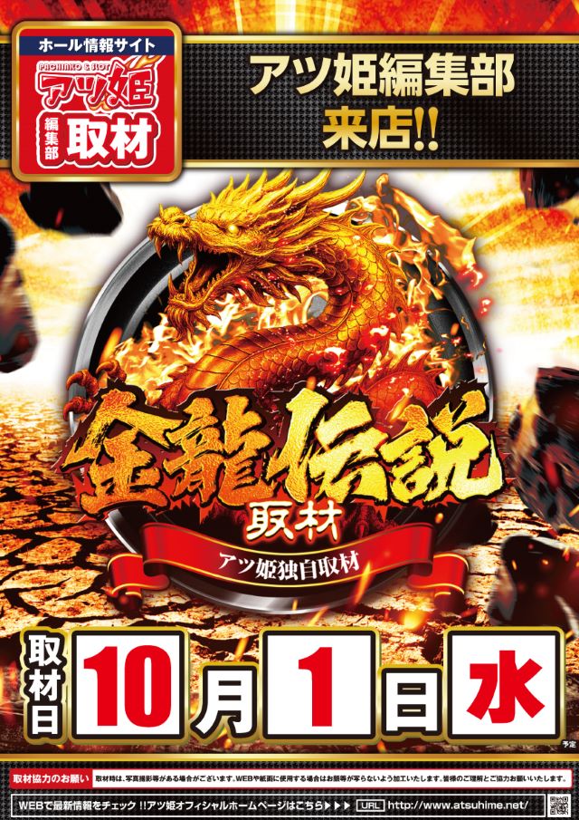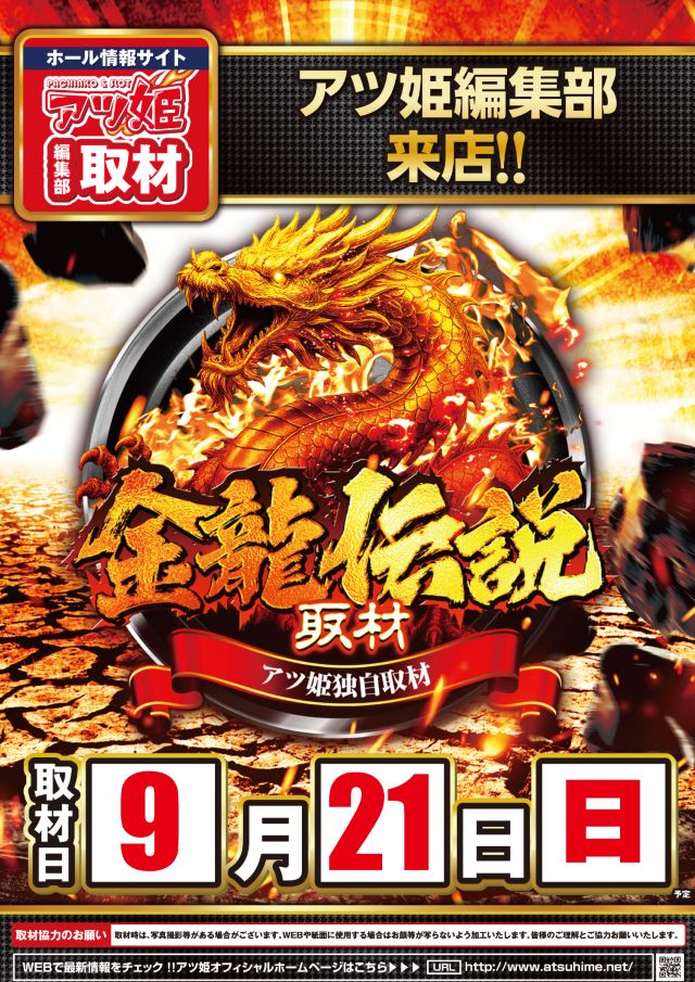 9/21(日)スロット取材!金龍伝説!8時オープン!