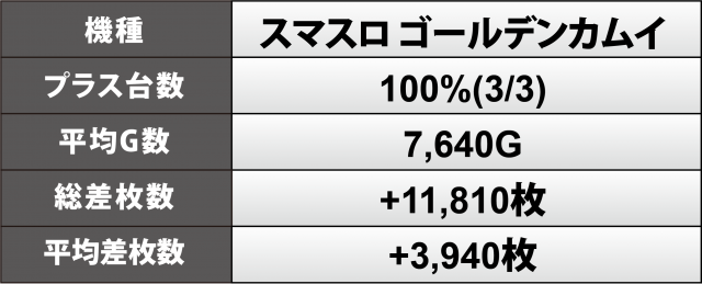 3機種の中で最注目は『スマスロ ゴールデンカムイ』。+8千枚弱を筆頭に設置3台全てがプラス。その平均は+4千枚に迫るハイクオリティとなった。
