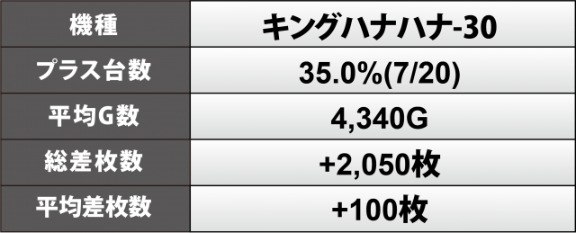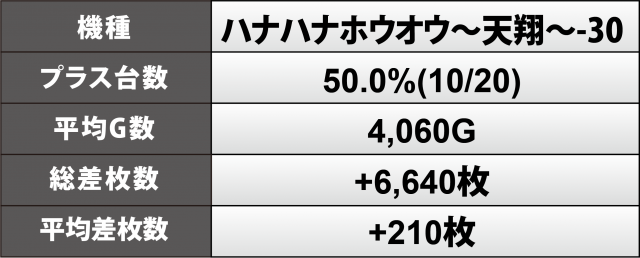 また両者共に20台設置と同店最多となる『キングハナハナ-30』『ハナハナホウオウ~天翔~-30』も全台の合計で勝利を収めた。