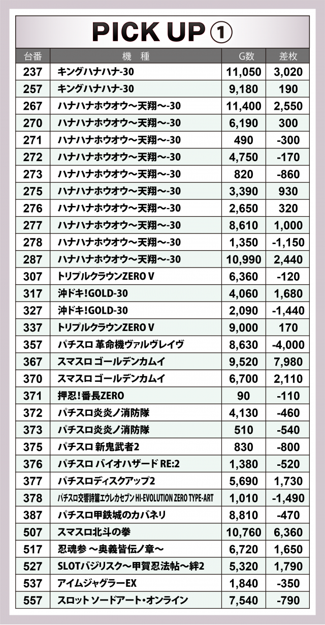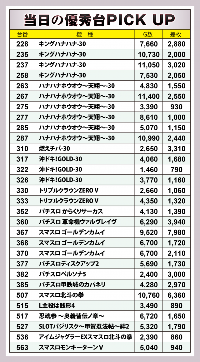 ここからは、当日の出玉データから優秀台をピックアップしていこう。